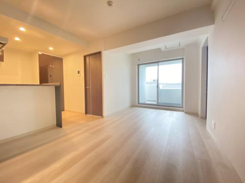 Villa Musica西宮北口におけるLDK(リビングダイニングキッチン)と洋室部分は、音楽を楽しみながら快適に暮らすために設計された住空間であり、特にLDKは約12.7帖と広さにゆとりがあり、白を基調としたシンプルで上品な内装が施されており、開放感を演出するとともに、採光や家具配置にも配慮された整った形状が特徴です。LDK内には機能性とデザイン性を両立したシステムキッチンが設置されており、2口ガスコンロやグリル、収納力に優れたキャビネットが完備されているため、自炊派の方やファミリーにも嬉しい仕様となっています。また、キッチンからリビング・ダイニングを一望できるレイアウトとなっており、調理中でも家族や来客との会話がしやすいことや、リビング部分との一体感が生まれるため、空間の広がりを感じられる点も魅力です。冷暖房設備としてはエアコンが設置されており、加えて断熱性と遮音性を兼ね備えた壁構造により、外気や周囲の音を遮断しながら、年中快適な室温を保つ工夫がなされています。洋室については、7.5帖の主寝室と5.6帖の洋室の2部屋があり、7.5帖の洋室は一般的に主寝室として想定される広さで、クローゼット付きのため衣類や生活用品の収納にも困らず、ベッドやデスク、ドレッサーなども十分に配置できる広さがあります。特筆すべきはこの洋室が防音室として設計されている点で、遮音性能D-70等級相当の構造により、ピアノや弦楽器、声楽などの演奏が室内で可能とされており、隣戸への音漏れを気にすることなく演奏や録音、オンラインレッスンなどに集中できる空間です。一方、5.6帖の洋室は子ども部屋や書斎、ワークスペースとして使いやすい広さであり、在宅ワークや趣味の部屋としての用途にも適しており、窓があるため自然光も取り入れられ、閉塞感のない快適な居住空間となっています。両洋室ともにフローリング仕上げで、家具のレイアウトの自由度が高く、さらに遮音ドアなどの工夫が施されていることから、生活音や演奏音の干渉を最小限に抑えられる設計となっており、住まう人のライフスタイルや目的に応じて柔軟に活用できる居住性の高いプライベート空間が確保されています。