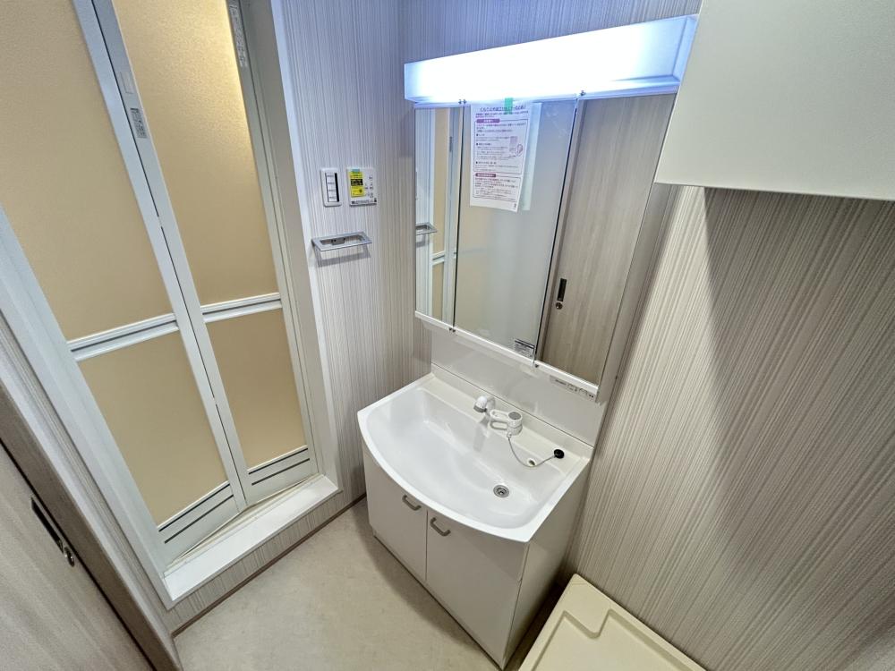 グランディール清華2・303号室の独立洗面台は、朝夕の身支度を快適に行うための実用性と清潔感を重視した設備だと考えられます。洗面スペースが浴室やトイレと明確に分けられていることで、家族や同居人がいる場合でも時間帯を気にせず使いやすく、生活リズムの違いによるストレスを感じにくい点が大きな魅力です。一人暮らしであっても、来客時に生活感が出にくいことは安心材料になります。 洗面ボウルまわりには、顔を洗う、歯を磨く、身だしなみを整えるといった日常動作をスムーズに行える十分なスペースが確保されていることが想定されます。鏡も視認性の高い位置に設置されており、朝の忙しい時間帯でも落ち着いて準備ができるでしょう。また、洗面台下や鏡裏などに収納が備えられている場合、洗剤やタオル、スキンケア用品をすっきり整理でき、洗面所全体を清潔に保ちやすくなります。 内装は明るく清潔感のある色合いでまとめられていることが多く、水はねや汚れが目立ちにくい素材が使われている点も、日々の手入れを考えると大きなメリットです。掃除がしやすいことで、忙しい日常の中でも快適な状態を無理なく維持できます。 このように303号室の独立洗面台は、特別に豪華というよりも、毎日の暮らしに自然と馴染み、使うたびに「便利さ」を実感できる設備だと言えるでしょう。生活の質をさりげなく支えてくれる存在であることが、この独立洗面台の魅力です。